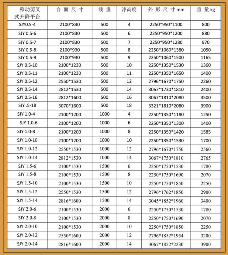,濟(jì)南龍宇升降機(jī)械是專業(yè)生產(chǎn)制造廠家,剪叉式升降車:SJY4~18米升降機(jī),300-2000kg移動剪叉升降臺,采用中德合資優(yōu)質(zhì)泵站。移動式升降機(jī)為四輪移動行走,垂直升降,其剪叉主結(jié)構(gòu)采用上海寶鋼錳鋼矩形管制作,工作臺面寬大,結(jié)構(gòu)堅固,承載能力高,升降平穩(wěn),安裝維護(hù)簡單方便,可多人同時工作,使高空作業(yè)更安全、效率更高。根據(jù)其使用環(huán)境和使用要求,可以選擇不同的動力組合,選擇不同的可選配置,完成舉升物品等任務(wù),取得更好的使用效果。通過剪叉數(shù)量的增加來提高升降機(jī)能夠到達(dá)的高度,平臺采用電動升降控制,上下均可操作,該電動升降機(jī)的動力單元采用德國鞍山合資泵站,分為220v和380v電源。另備有手動液壓泵,停電時可通過手動形式達(dá)到設(shè)備升降目的。臺面設(shè)有防滑絕緣扣板,保證貨物及人員的安全,更換方便,易于清潔,整體美觀大氣。移動剪叉式升降機(jī)上還設(shè)置了防爆閥及應(yīng)急下降閥等安全保護(hù)裝置,在停電時可以通過手動的形式達(dá)到設(shè)備升降,舉升貨物或高空作業(yè)的目的,帶來極大便利。平臺四邊設(shè)有護(hù)欄,保證了貨物及人員的安全??筛鶕?jù)需求設(shè)置可探出式臺面,增大作業(yè)空間。同樣可根據(jù)客戶使用環(huán)境需要加裝防爆及電瓶行走。載重分為300公斤、500公斤、1000和2000公斤,升高從4米到20米不等。此款電動升降機(jī)主要適用于工礦、車間、路政、車站、碼頭等場所機(jī)械安裝、設(shè)備維修、建筑保養(yǎng)等行業(yè)。