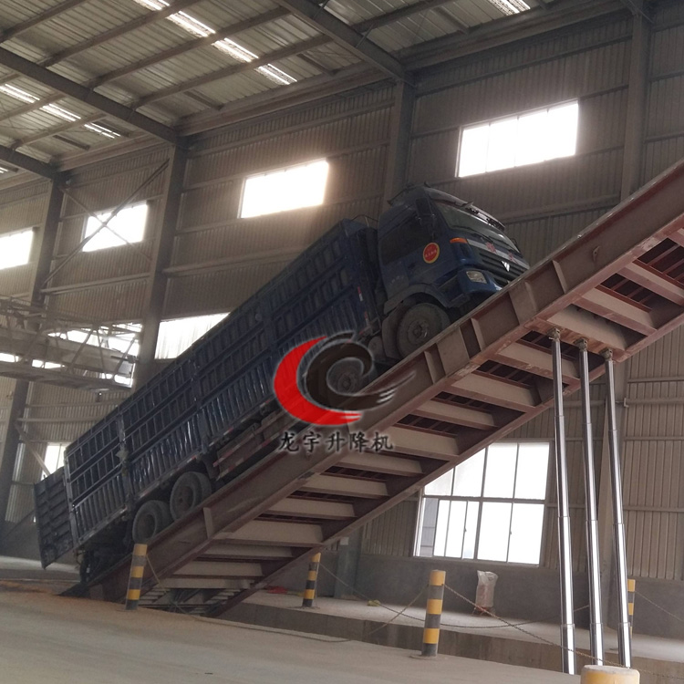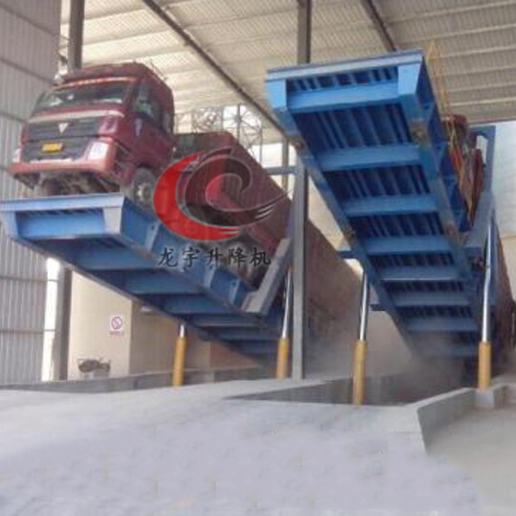 其過(guò)程是將貨車(chē)開(kāi)到液壓卸車(chē)平臺(tái),啟動(dòng)擋車(chē)裝置,用液壓系統(tǒng)舉起平臺(tái),達(dá)到一定角度,使散裝貨物自動(dòng)滑下。這樣卸車(chē)既節(jié)省了時(shí)間,節(jié)省了人力,又提高了效率,降低了成本。