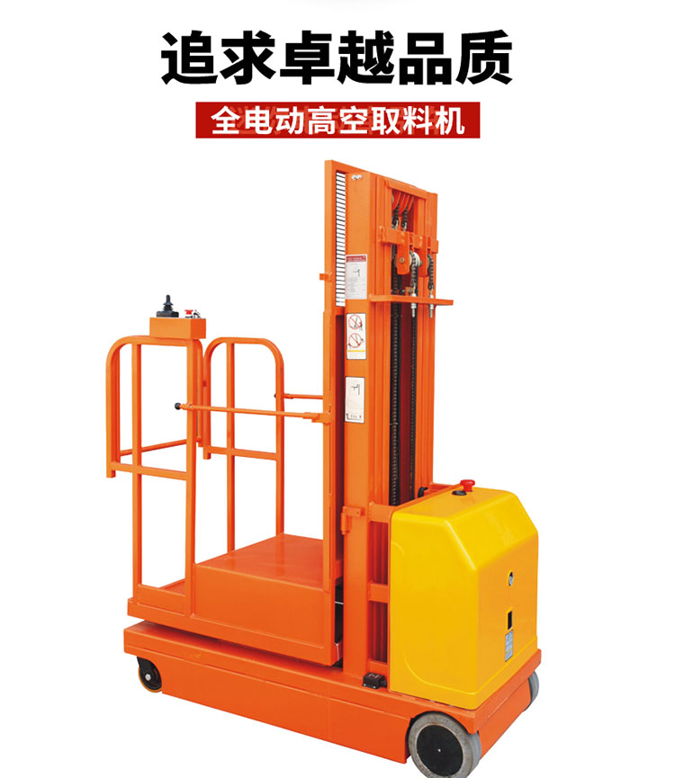 全電動(dòng)高空取料平臺(tái),平臺(tái)高度從2.7m-4.5m,安全承重200kg,操作靈活方便,是倉(cāng)庫(kù)、超市等狹窄場(chǎng)所堆貨和取料的佳選擇。