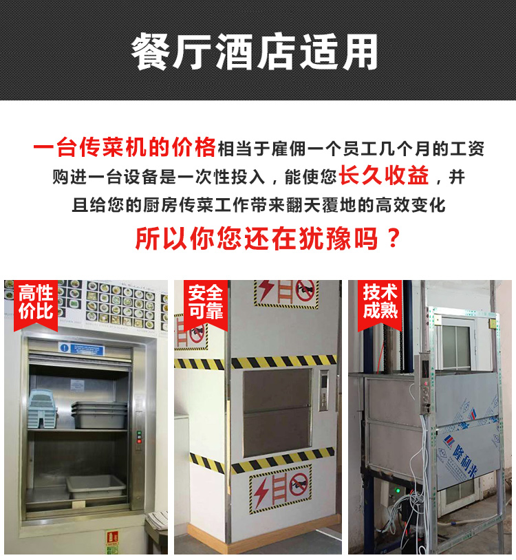 傳菜梯廣泛應(yīng)用于餐飲行業(yè),酒店、賓館、餐廳、食堂等場(chǎng)所,甚至多數(shù)聯(lián)鎖快餐店都安裝使用傳菜機(jī),從而節(jié)省大部分人力物力,提高作業(yè)效率。