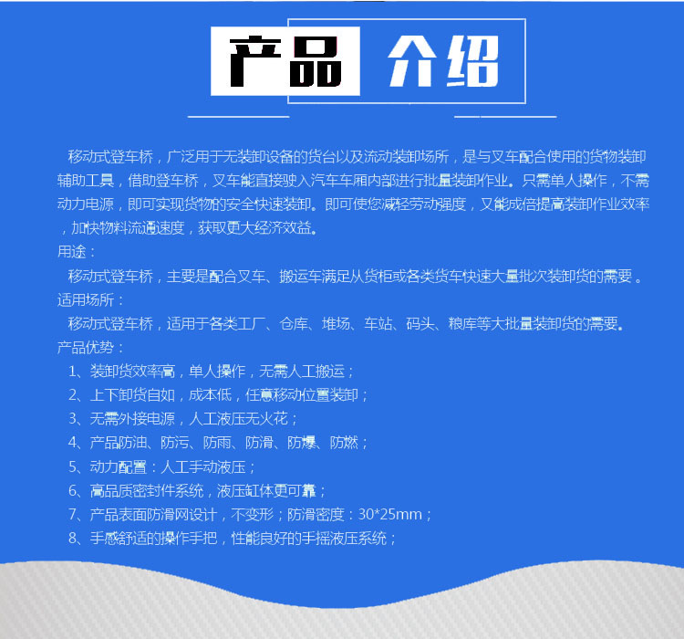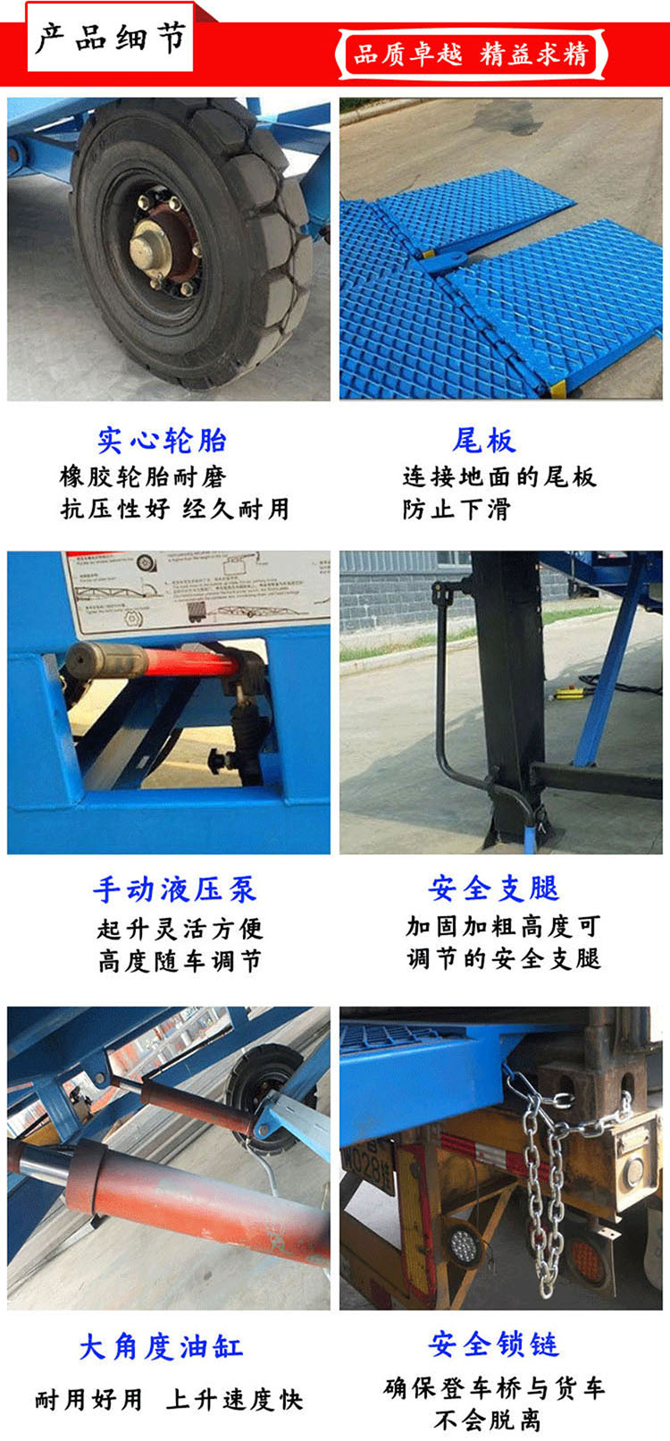 3、移動式登車橋必須將設(shè)備放置在堅實的地面上,移動時限速3KM/H。