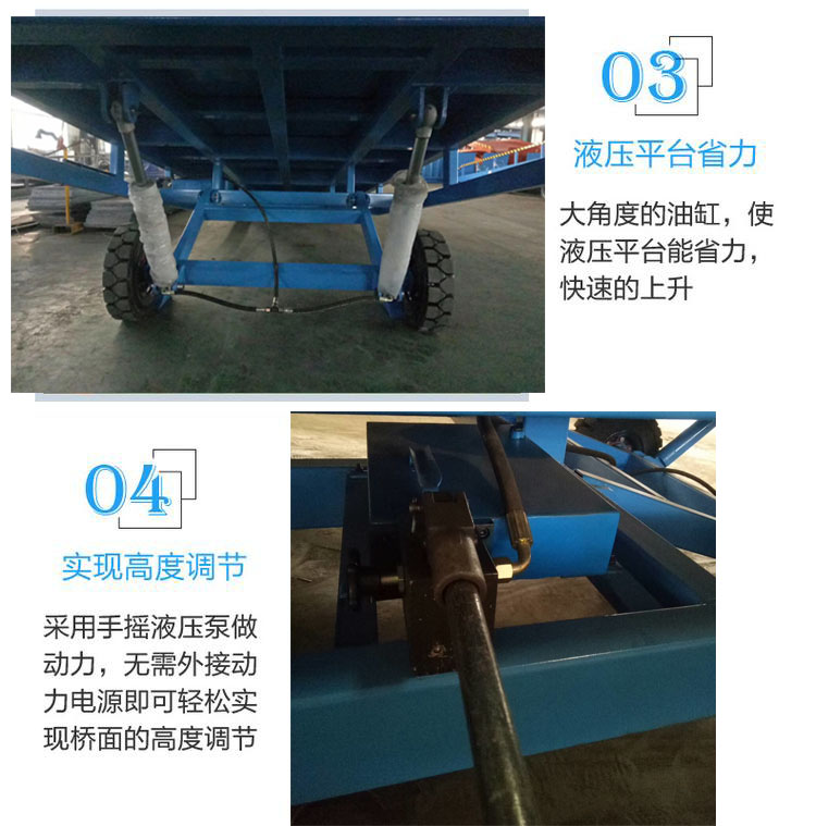 2、手動式液壓泵動力調(diào)節(jié)高度,無需外接電源,操作安全方便。